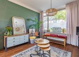 Vanuit de hal loop je de keuken in, die in open verbinding met de woonkamer staat. De donkere laminaatvloer past goed bij de kleuren op de muren en aan twee kanten veel licht naar binnen. Het zitgedeelte is aan de voorzijde en aan de achterzijde, naast de keuken, is genoeg plek voor de eettafel.