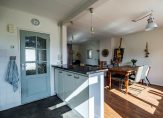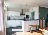 Van dichte keuken naar open keuken, het maakt met name de keuken optische een stuk ruimer. Er ligt dezelfde vloer als in de hal en de lichte wandopstelling (2019) heeft een ingebouwde gaskookplaat, afzuigkap, vaatwasser, koelkast en een combi-oven. Aan de kant van de woonkamer, onder het fraaie aanrechtblad, bieden drie kasten extra bergruimte.
