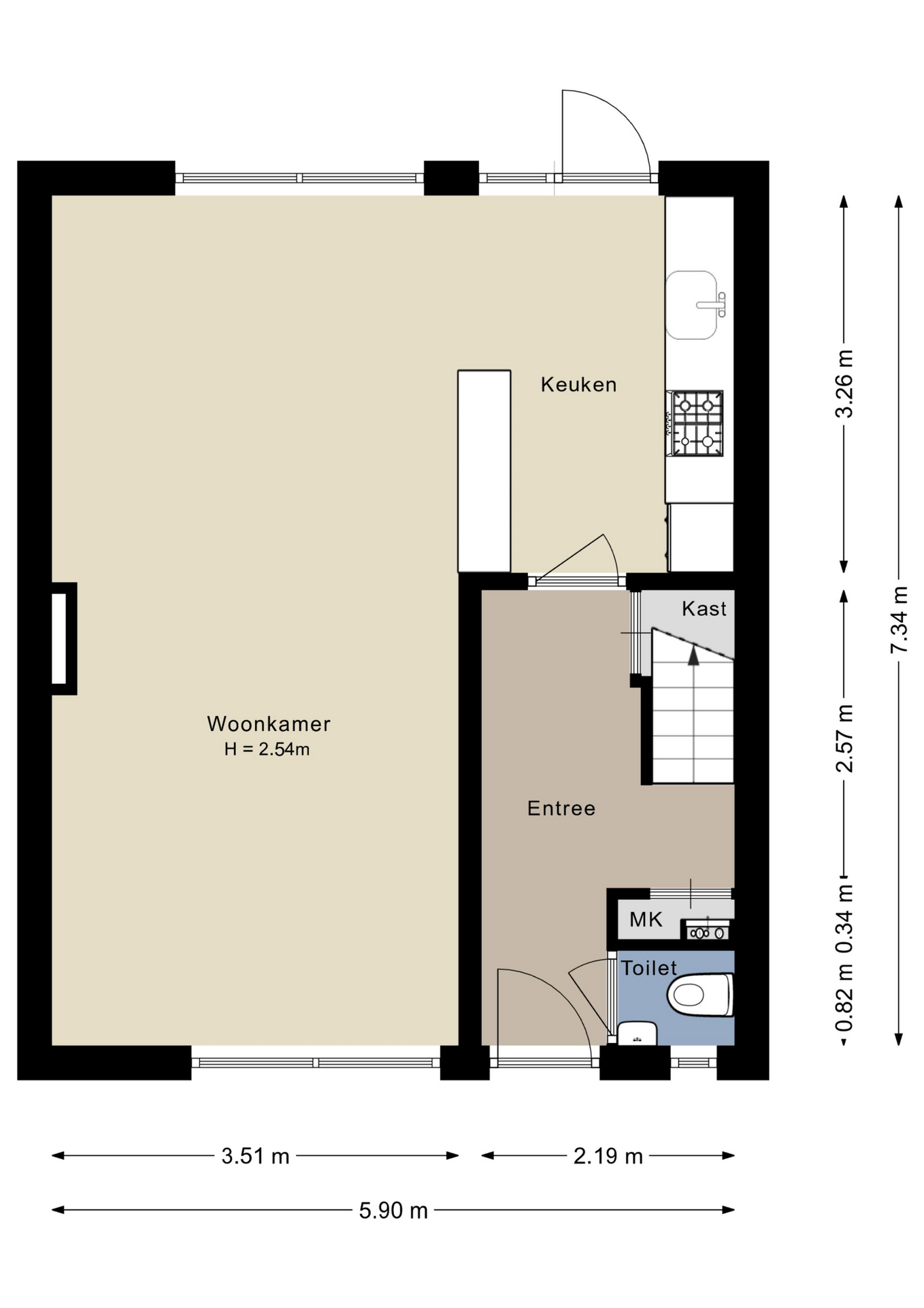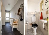 In de brede hal, aan de rechterzijde, is de trap naar de eerste verdieping. Een donkere tegelvloer geeft de hal een fraaie uitstraling en onder de trap is een handige bergkast, die als garderobe of provisieruimte gebruikt kan worden. Ook de toiletruimte met fonteintje is vanuit de hal te bereiken.