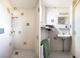 De badkamer heeft, heel fijn, een groot raam waardoor veel licht naar binnen valt. Je ziet lichte wand- en vloertegels, een ruime douche en een wastafel met spiegel en planchet.