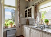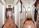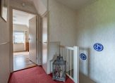 Volg het grindpad vanaf de weg, richting de entree van de woonboerderij. Hier zie je mooie raamluiken, en een echte bel om je bezoek aan te kondigen. Eenmaal binnen sta je in een lange hal, met de trap naar de eerste verdieping. Aan de voorzijde zijn de keuken, met een hoekopstelling, en een berging/provisieruimte. De frontjes van de keuken zijn vernieuwd, net als een deel van de apparatuur.