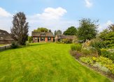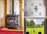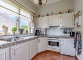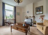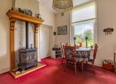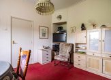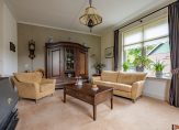 De eetkamer en aansluitende woonkamer bevinden zich aan de andere zijde van de hal. Blikvanger in de eetkamer is de schouw met prachtige tegels en een gaskachel, en in de woonkamer staat een gashaard. Het uitzicht naar de tuin, in de woonkamer aan twee zijden, is fraai.