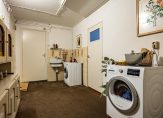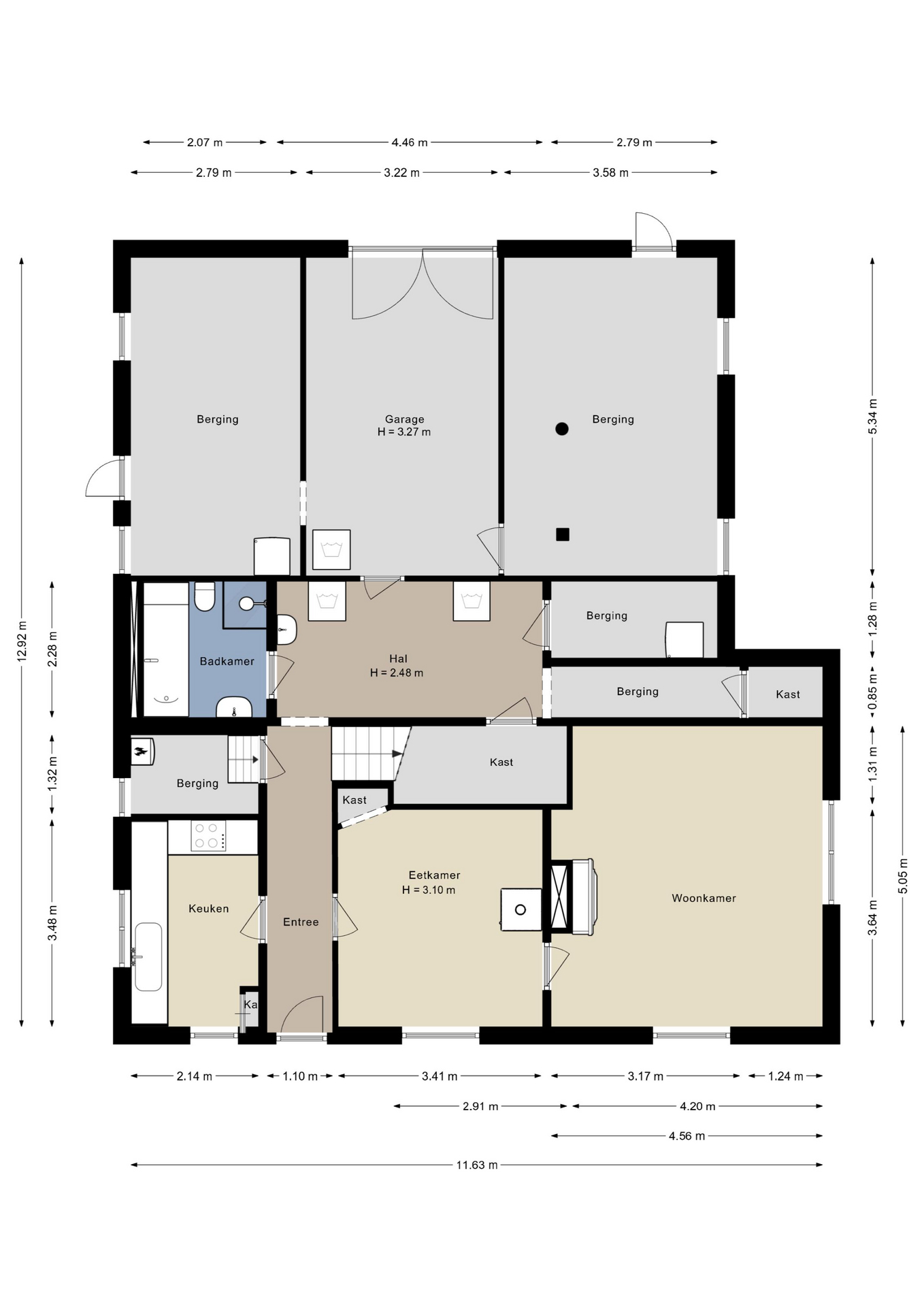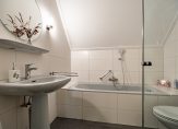 Het linkerdeel van de woonboerderij biedt ruimte aan een garage, meerdere bergingen, een wasruimte en de in 2024 vernieuwde badkamer. Deze is ingedeeld met een ligbad, aparte douche, toilet en een wastafel. Beide bergingen hebben een buitendeur, en de garage heeft dubbele deuren om met de zitmaaier naar binnen en buiten te rijden.