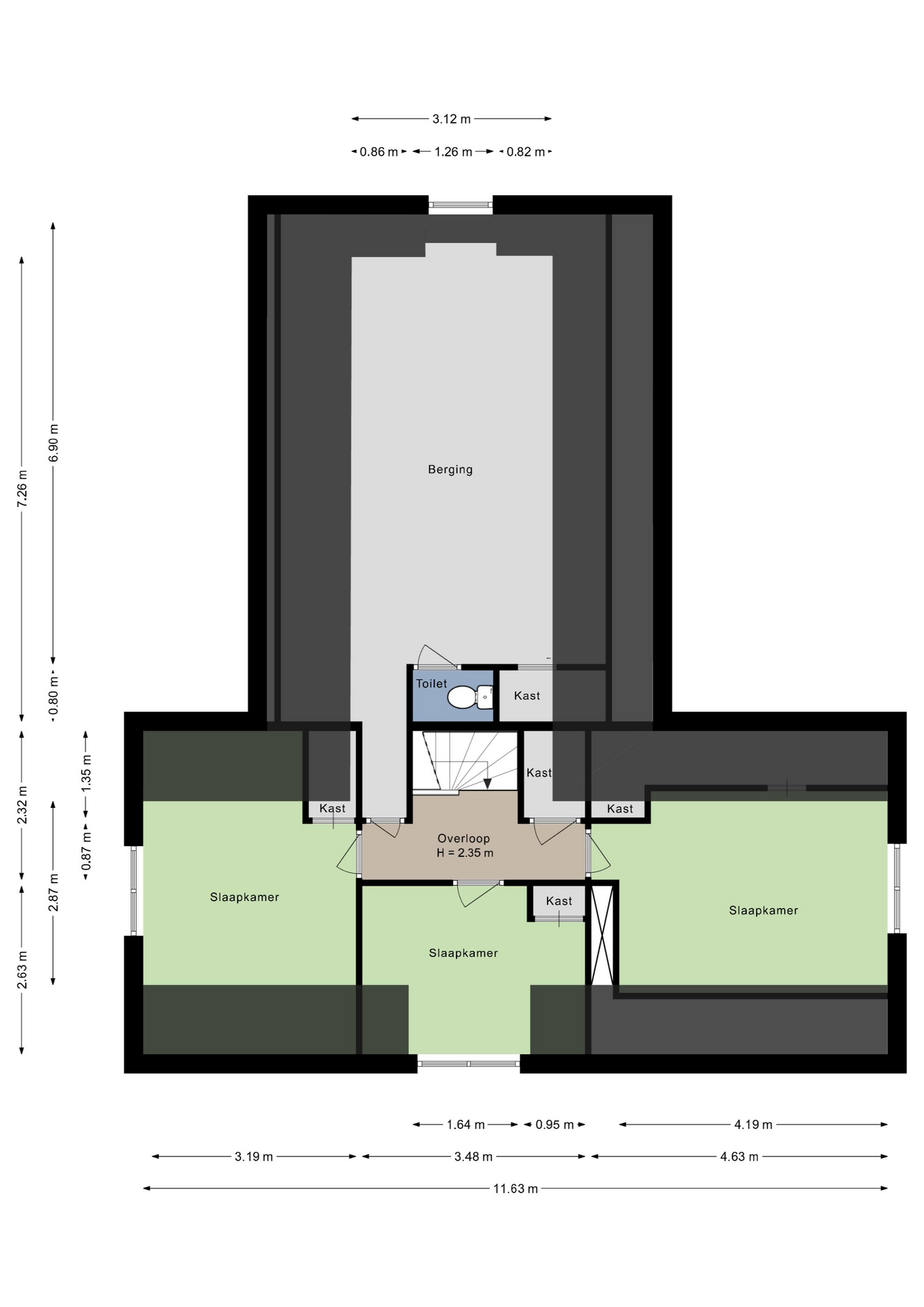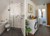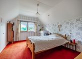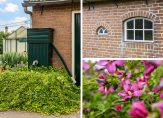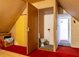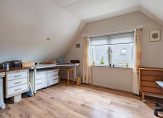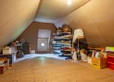 Boven de voormalige stallen is een zeer royale berging, klaar voor een nieuwe invulling. Het deurtje met ruitvormig raam is de plek waar vroeger het hooi naar binnen kwam. Ook bevindt zich hier een toiletruimte, op slechts een paar stappen van de slaapkamers.