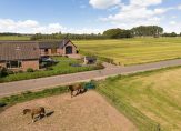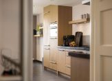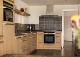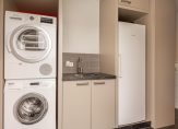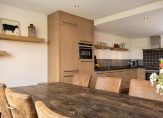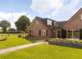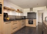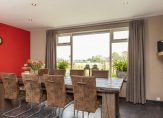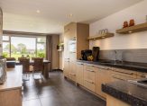 Het hart van deze woning is de zeer ruime woonkeuken in het voorhuis. Een grote tafel kan hier prima staan en het uitzicht naar de landerijen aan de overzijde van de weg is fantastisch. De zeer uitgebreide keukenopstelling met granieten blad biedt veel bergruimte en de gaskookplaat, afzuigkap, vaatwasser ‘op hoogte’, oven, combimagnetron en XL-koelkast zijn ingebouwd. In de aangrenzende bijkeuken met op maat gemaakte kastenwand en een spoelbak is ruimte voor een vriezer, de wasmachine en droger.