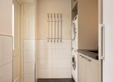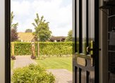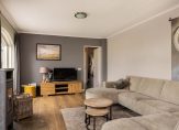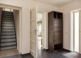 Tussen het voor- en het achterhuis bevindt zich de entree van deze verrassend ruime, halfvrijstaande woning. In de hal zie je direct dat deze woning veel sfeer en wooncomfort heeft. Onder de donkere vloertegels ligt vloerverwarming en de binnendeuren zijn uitgevoerd als paneeldeur. De kastenwand met schuifdeuren biedt veel bergruimte en de toiletruimte met fonteintje is van groot formaat.