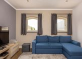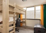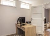 In het achterhuis zijn de woonkamer en twee (slaap)kamers gesitueerd. De woonkamer met grote speksteenkachel is een fantastische leefruimte met twee grote ramen, aan de buitenzijde voorzien van donkergroene luiken. Als je op de bank zit, geniet je volop van het uitzicht naar de tuin. Één van deze twee grote ramen zijn openslaande deuren, je stapt hierdoor direct op het luxe terras. De (slaap)kamers in het achterhuis zijn nu in gebruik als werkkamer en game-ruimte.