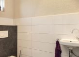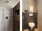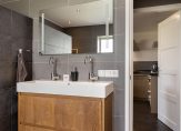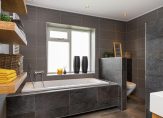 In het voorhuis bevindt zich de badkamer van groot formaat. De ruimte is fraai ingedeeld met antracietkleurige wand- en vloertegels, een breed badmeubel met twee kranen, een spiegel met verlichting, een ligbad, inloopdouche en een nis met wandcloset.