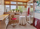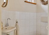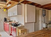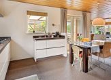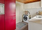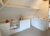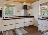In de ruime keuken ligt een siergrindvloer die doorloopt in de aangrenzende bijkeuken. De moderne hoekopstelling in de keuken is geplaatst in 2009. Grote lades en kasten bieden veel bergruimte en het composiet aanrechtblad biedt voldoende plaats voor de kookliefhebber. De gaskookplaat, afzuigkap, vaatwasser, combi-oven/magnetron en koelkast zijn ingebouwd. De keuken is meer dan een plek om te koken, want er is ruimte voor een tweede eettafel. Vanuit de keuken, verbonden met het overdekte terras via openslaande deuren, hebt u goed zicht op de prachtige tuin. In de bijkeuken vindt u een keukenblok met lades, een bijpassende kast met magnetron, vriezer en veel opbergruimte, een ruim aanrecht met spoelbak en aansluitingen voor een wasmachine en wasdroger.