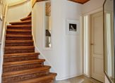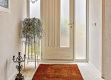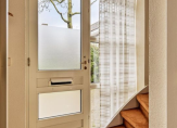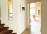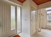 Aan de voorzijde is de overdekte entree van dit zeer ruime woonhuis. In de hal ligt een fraaie natuurstenen vloer die doorloopt in het toilet, de entree van de praktijkruimte, de badkamer en de woonkamer.