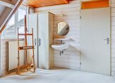 Gelijkvloers wonen is mogelijk dankzij de slaap- en badkamer op de begane grond. De slaapkamer is ruim opgezet, met twee vaste garderobekasten aan weerszijden van de open verbinding naar de badkamer. In de badkamer bevinden zich een ligbad, inloopdouche en twee wastafels. De badkamer is ook vanuit de hal te bereiken.