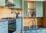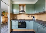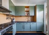 Bij het eetgedeelte is een deur naar de dichte keuken, met een donkere tegelvloer en een hoekopstelling in een groene kleur. Deze keuken, met diverse houtlook accenten, heeft een ingebouwde gaskookplaat, afzuigkap en oven.