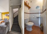 Achter de andere deur in de woonkamer is een portaal, met tapijt op de vloer en de trap. Hier is de nette toiletruimte, met deels betegelde wanden en een fonteintje.
