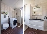 De badkamer is deels vernieuwd, met behoud van de originele wand- en vloertegels. Zo zie je een wandcloset, een breed wastafelmeubel met spiegel, een hoge kast en in de douche hangt een luxe douchekop met thermostaatkraan.