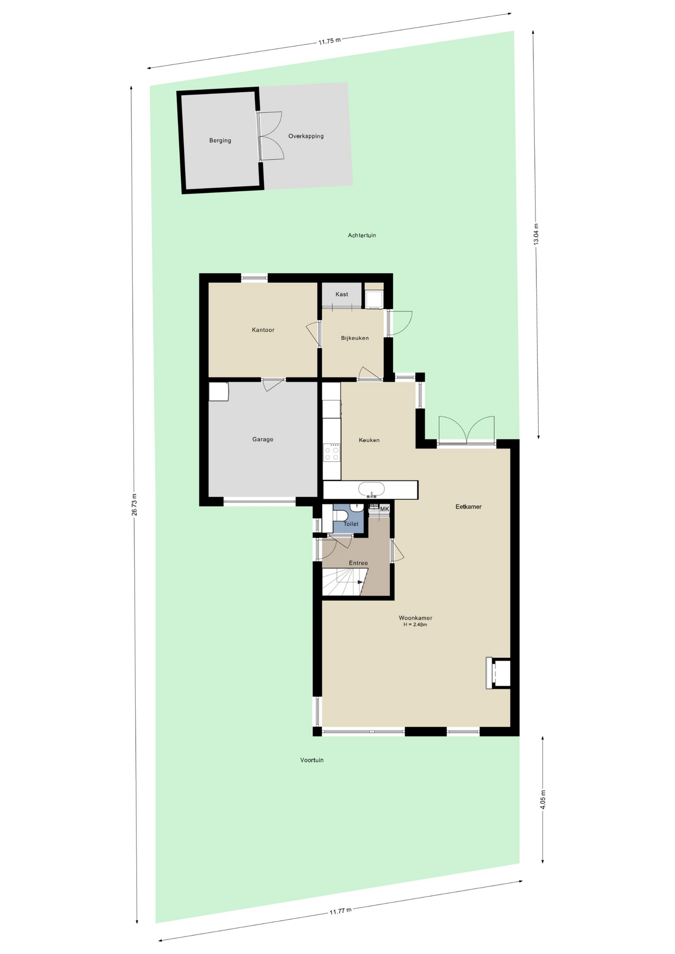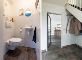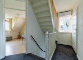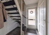 Vanuit de ruime oprit, waar zeker 3 auto’s geparkeerd kunnen worden, via de carport, is de voordeur van de woning. Eenmaal binnen sta je in de hal, met de trap aan de rechterzijde en de toiletruimte aan de linkerzijde. Onder de trap is plek voor een kapstok en de donkere tegelvloer ligt op een groot deel van de begane grond.