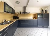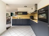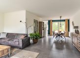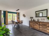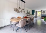 Aan de achterzijde is het eetgedeelte, met openslaande deuren naar de tuin. Naast het eetgedeelte is de halfopen keuken, waar een royale hoekopstelling staat. Het aanrechtblad, de achterwand en enkele andere doelen zijn in een houtlook, wat goed past bij de rest van de keuken. Alle benodigde apparatuur is ingebouwd: een inductie kookplaat (2023), afzuigkap, combi-oven (2020), koelkast (2010), vaatwasser (2024) en een vriezer.