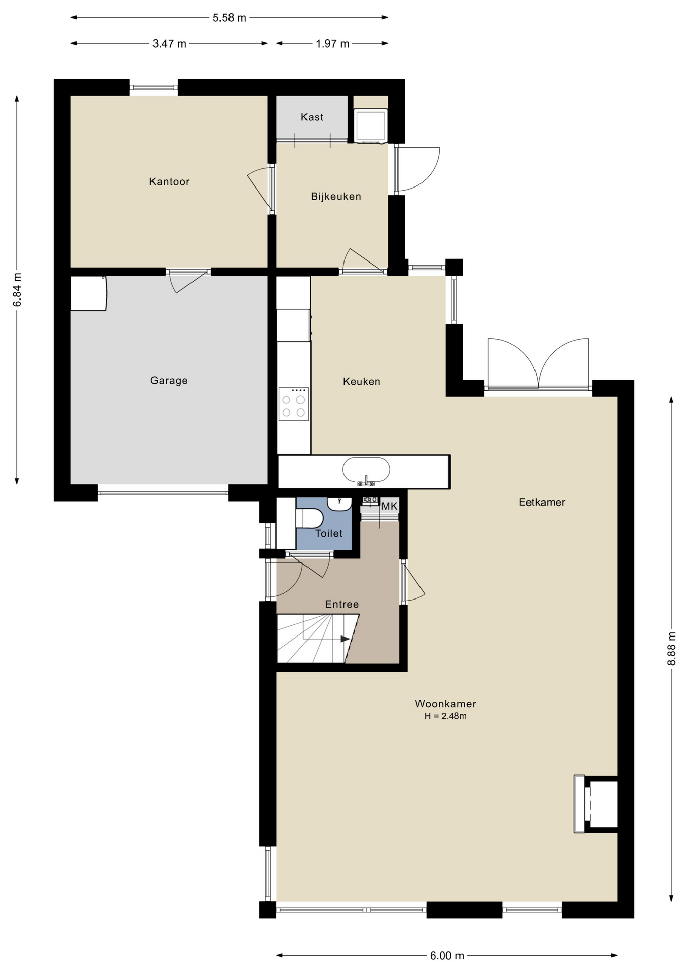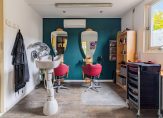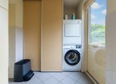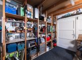 In het verlengde van de keuken is de bijkeuken, met een vaste kastenwand en de opstelling van de wasapparatuur. Vanaf hier zijn de tuin en de kapsalon te bereiken. De kapsalon is niet alleen voorzien van elektra en warm/koud water, maar er hangt ook een airco/verwarmingsunit aan de wand. De inpandig te bereiken garage/berging is een prima ruimte voor de fietsen, auto en andere spullen.