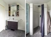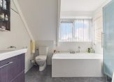 Naast deze kamer is de badkamer met een ligbad, inloopdouche, een tweede toilet, wastafelmeubel en een tweedeurs spiegelkast. Ook deze ruimte is heel licht, dankzij de dakkapel aan de achterzijde.