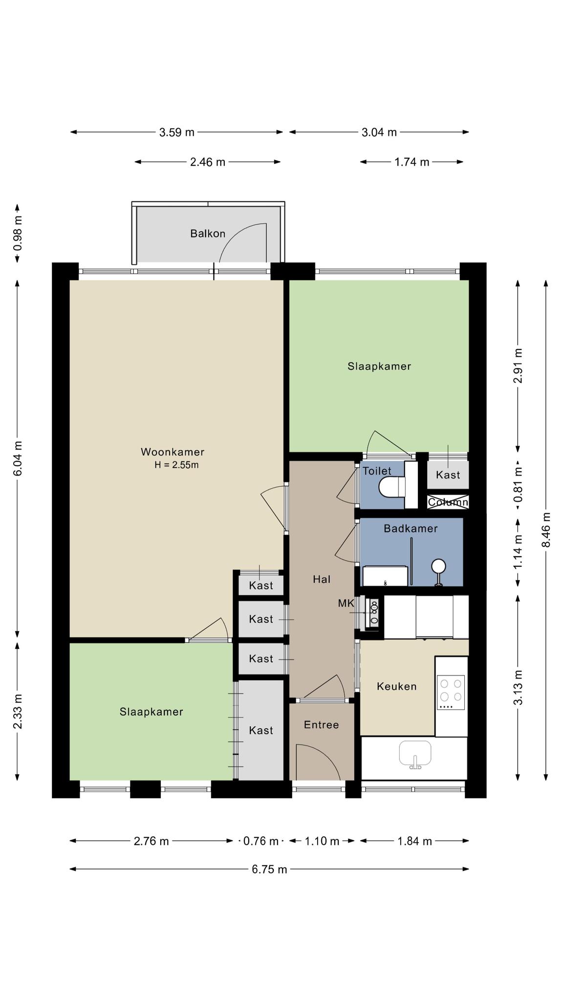 Dit appartement heeft twee ruime slaapkamers. De slaapkamer aan de voorzijde heeft geen raam aan de galerij, maar in de zijgevel aan de westkant. Hierdoor heb je niet alleen mooi uitzicht, maar ook geen mensen die over de galerij langs de slaapkamer lopen. De tweede slaapkamer is aan de achterzijde gesitueerd.