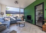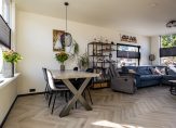 De woonkamer is een gezellige leefruimte met grote ramen aan drie zijden, waardoor het de hele dag veel licht naar binnen valt. Aan de voorzijde is het zitgedeelte en het eetgedeelte grenst aan de open keuken. Onder de visgraat pvc-vloer ligt vloerverwarming, net als in de keuken en de hal.