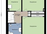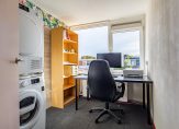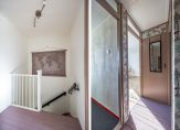 Het mooie behang in de hal zie je ook op de overloop, waar de houten vloer in een bijpassende kleur is geschilderd. Achter een van de deuren, waar nu een losse spiegel hangt, is een handige inbouwkast. De twee grootste slaapkamers hebben een dubbele inbouwkast, voor kleding en andere spullen, en de derde slaapkamer is ingericht was werkkamer/wasruimte.