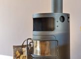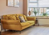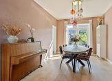 De woonkamer met erker en openslaande tuindeuren is een fraaie leefruimte, met een eikenhouten vloer en een zwarte houtkachel. Het zitgedeelte is aan de voorzijde en het eetgedeelte, met ruimte voor een piano en servieskast, aan de achterzijde.