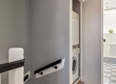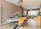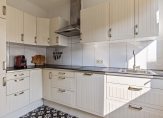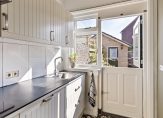 Bij het eetgedeelte is een doorgang naar de keuken, waar een lichte hoekopstelling met een fraai aanrechtblad staat. Deze keuken biedt veel bergruimte en de inductie kookplaat, afzuigkap, vaatwasser, koelkast en vriezer zijn ingebouwd. Leuk detail is de deur naar de tuin, die in twee delen te openen is.