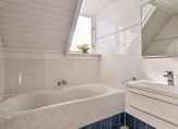 Het raam in de dakkapel zorgt voor prettig lichtinval in de badkamer. De ruimte is ingedeeld met een ligbad, aparte douche en een wastafelmeubel.