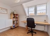 De hoofdslaapkamer met een meer dan 3 meter lange kastenwand bevindt zich aan de achterzijde en de slaapkamer aan de voorzijde is in gebruik als werkkamer. In beide slaapkamers en op de overloop ligt laminaat en in de hoofdslaapkamer zie je fraai donkergroen patroonbehang.