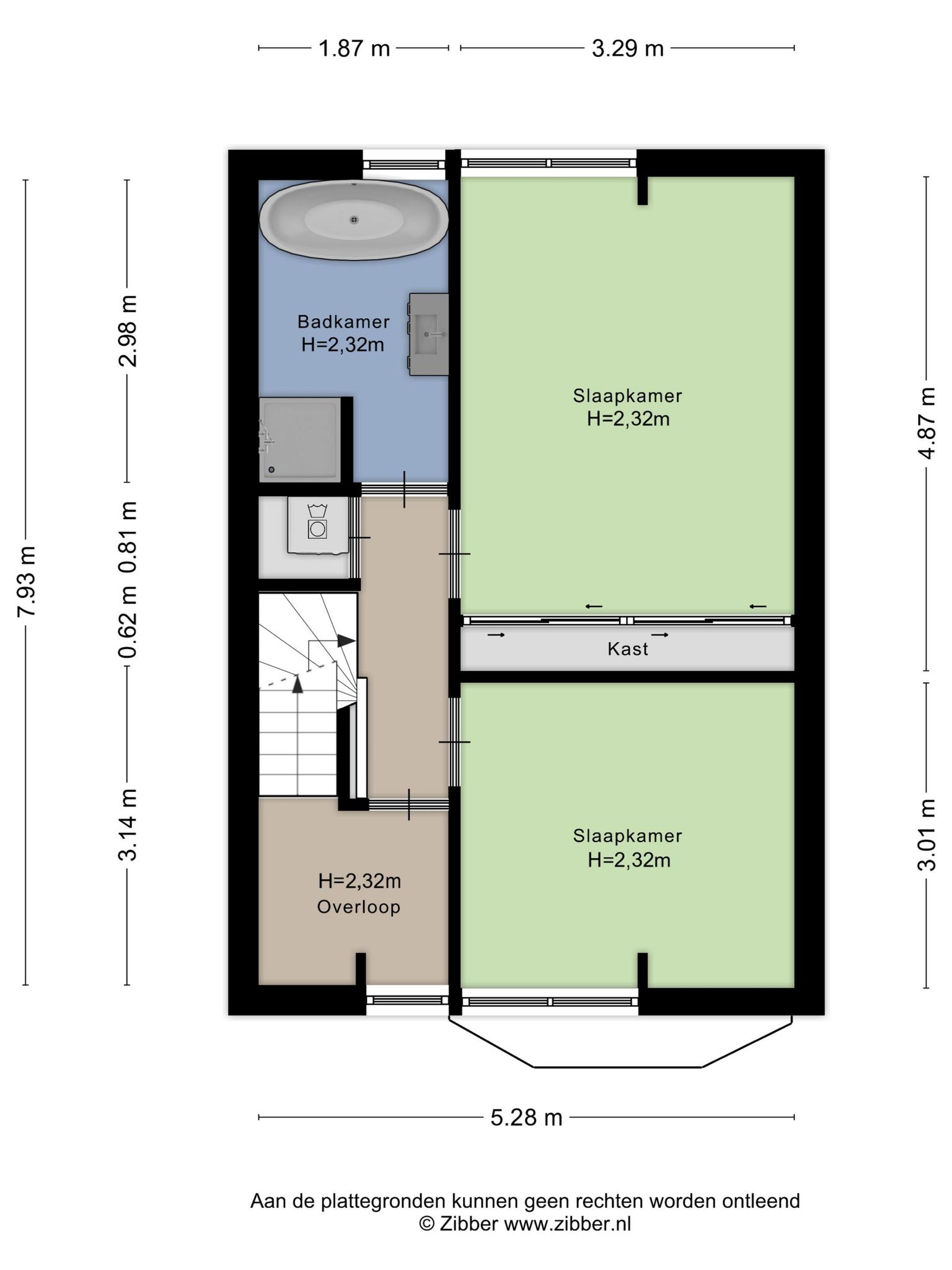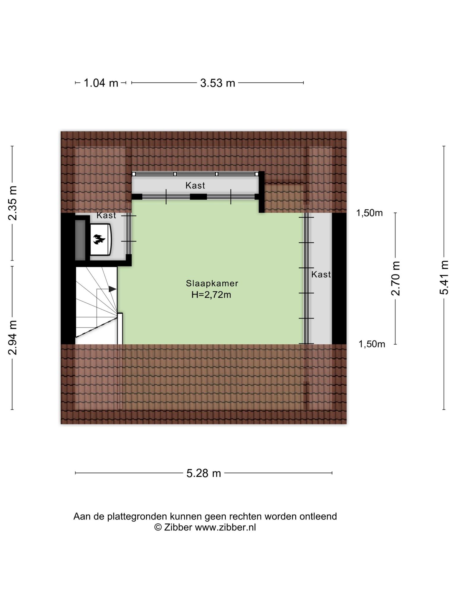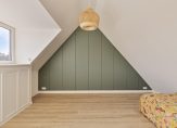 Op een apart, afgesloten gedeelte van de overloop is een vaste trap naar de tweede verdieping. Hier is een fraaie slaapkamer gecreëerd, met een donkergroene maatwerk kastenwand en handige kasten in de schuinte van het dak. Ook op deze verdieping ligt laminaat en achter de twee witte deuren is de opstelling van de HR-ketel.