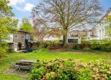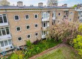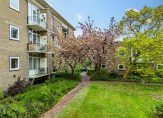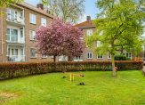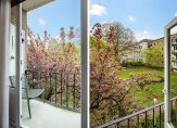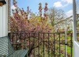 Vanuit de eet-/muziekkamer is het balkon te bereiken, met een uitstekende zonligging en uitzicht naar de gemeenschappelijke binnentuin. De bloesem in de boom is prachtig en verder zie je veel groen, zonder dat je verantwoordelijk bent voor het onderhoud…