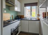 Aan de voorzijde is de dichte keuken, met dezelfde vloer als in bijna het hele appartement. De lichte hoekopstelling met een donker, kunststof aanrechtblad is voorzien van diverse inbouwapparatuur: een gaskookplaat, afzuigkap, combi-oven, vaatwasser, koelkast en een vriezer. Leuk detail; de originele provisiekast is behouden.