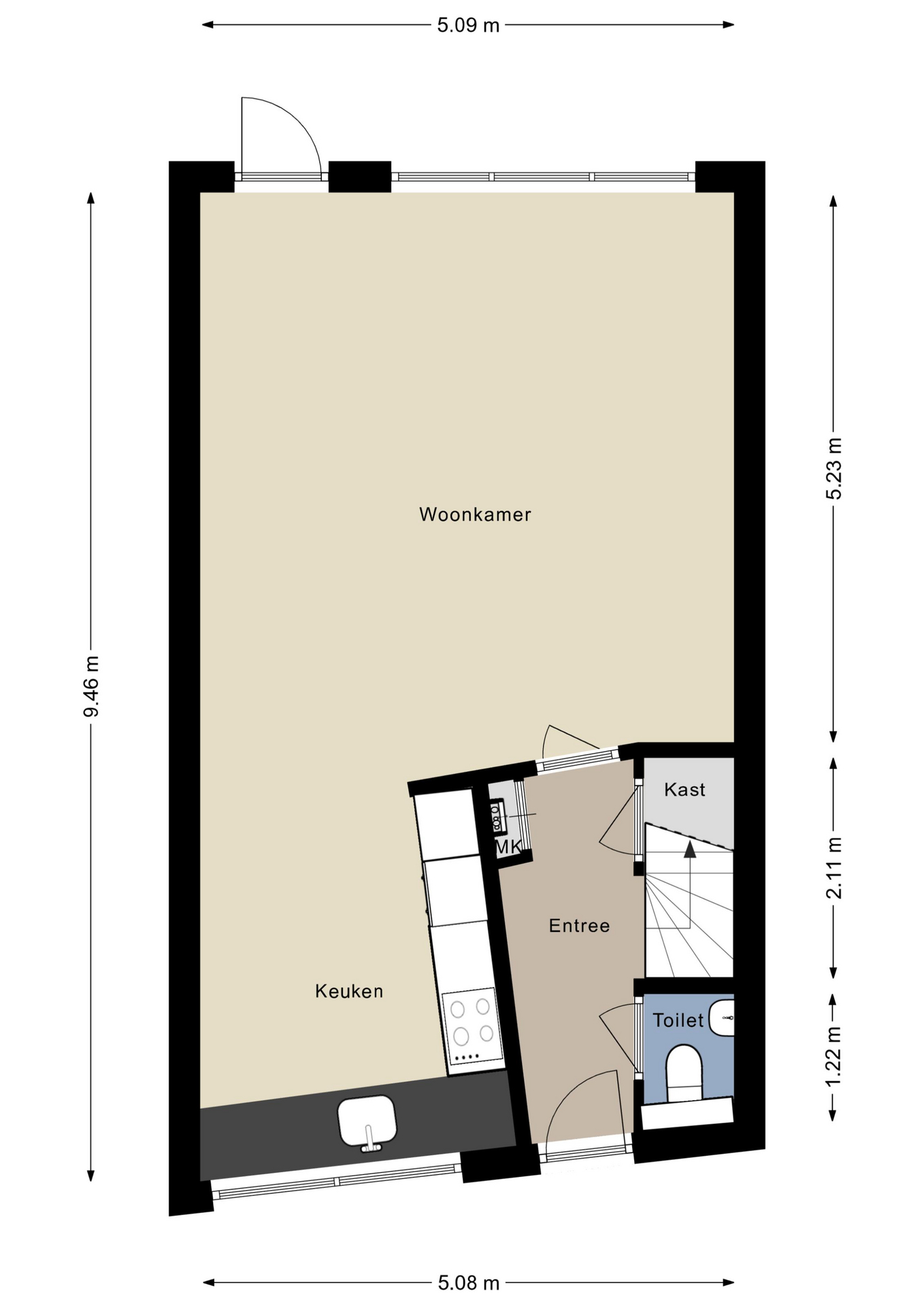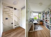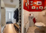 Voordat je naar binnen gaat, kijk even naar de mooi aangelegde voortuin met gevarieerde beplanting. Vervolgens ga je, via de voordeur, naar de lange hal. Hier zijn de meterkast, de trapopgang met bergkast en de toiletruimte. De basis van de toiletruimte is wit, en de bewoners hebben het bovenste deel van de wanden in een rode kleur geschilderd.