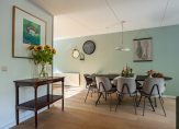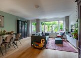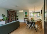 Niet alleen in de hal, maar ook in de woonkamer en keuken ligt een mooie parketvloer. De tuingerichte woonkamer, met grote ramen aan de westkant, heeft een breedte van ruim 5 meter. Er is genoeg plek voor een grote zithoek, een eettafel en meerdere kasten.