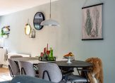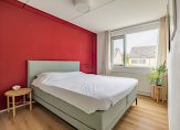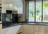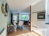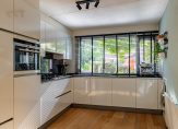 Dan de keuken, aan de voorzijde van de woning. Je oog valt op de lichte hoekopstelling, met een zwart aanrechtblad van composiet. Er is genoeg bergruimte, en alle benodigde apparatuur is ingebouwd: een 5-pits gaskookplaat, afzuigkap, vaatwasser (2024), koelkast (2024) en een combi-oven (2022). Heb je de keuken gezien, kijk dan nog even door het grote raam naar de voortuin en de rustige straat.