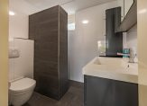 In 2010 is de badkamer vernieuwd, in stijlvol donkergrijs en wit. Boven het wastafelmeubel hangt een spiegelkast, en de hoge kast biedt extra bergruimte. Verder is de badkamer ingedeeld met een wandcloset, inloopdouche en mooie kranen.
