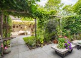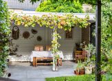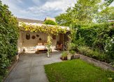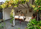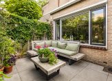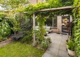 Vanuit de woonkamer is de sfeervolle achtertuin te bereiken, gesitueerd op het westen. Er is veel groen, onder andere bij de pergola, en er zijn twee terrassen gemaakt. Het achterste terras, bij de druivenstruik, is overdekt en heeft een poort naar de steeg. Ook is hier de deur naar de garage, voorzien van elektra.