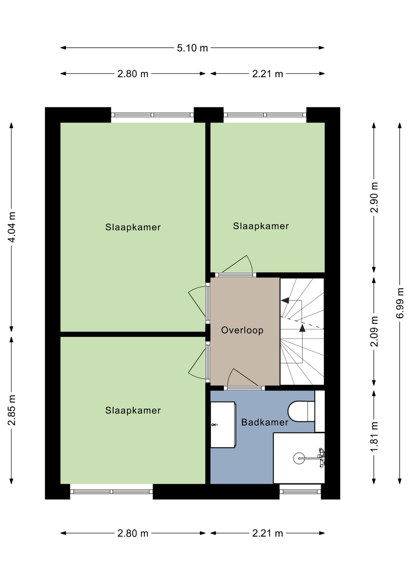 Vanaf de overloop zijn drie slaapkamers en de badkamer te bereiken. Op bijna de hele verdieping ligt laminaat, en de algehele afwerking is goed. Er zijn twee slaapkamers aan de achterzijde, in gebruik als master bedroom en werkkamer. De slaapkamer aan de voorzijde is in gebruik als kleedruimte.