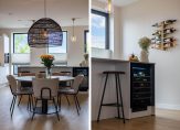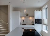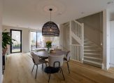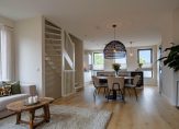 Via de trap in de hal loop je naar de eerste verdieping. Hier zijn de lichte, royale woon-/eetkamer en de open keuken. De sfeer wordt bepaald door de warme kleuren en de pvc-vloer met houtlook, voorzien van vloerverwarming.
