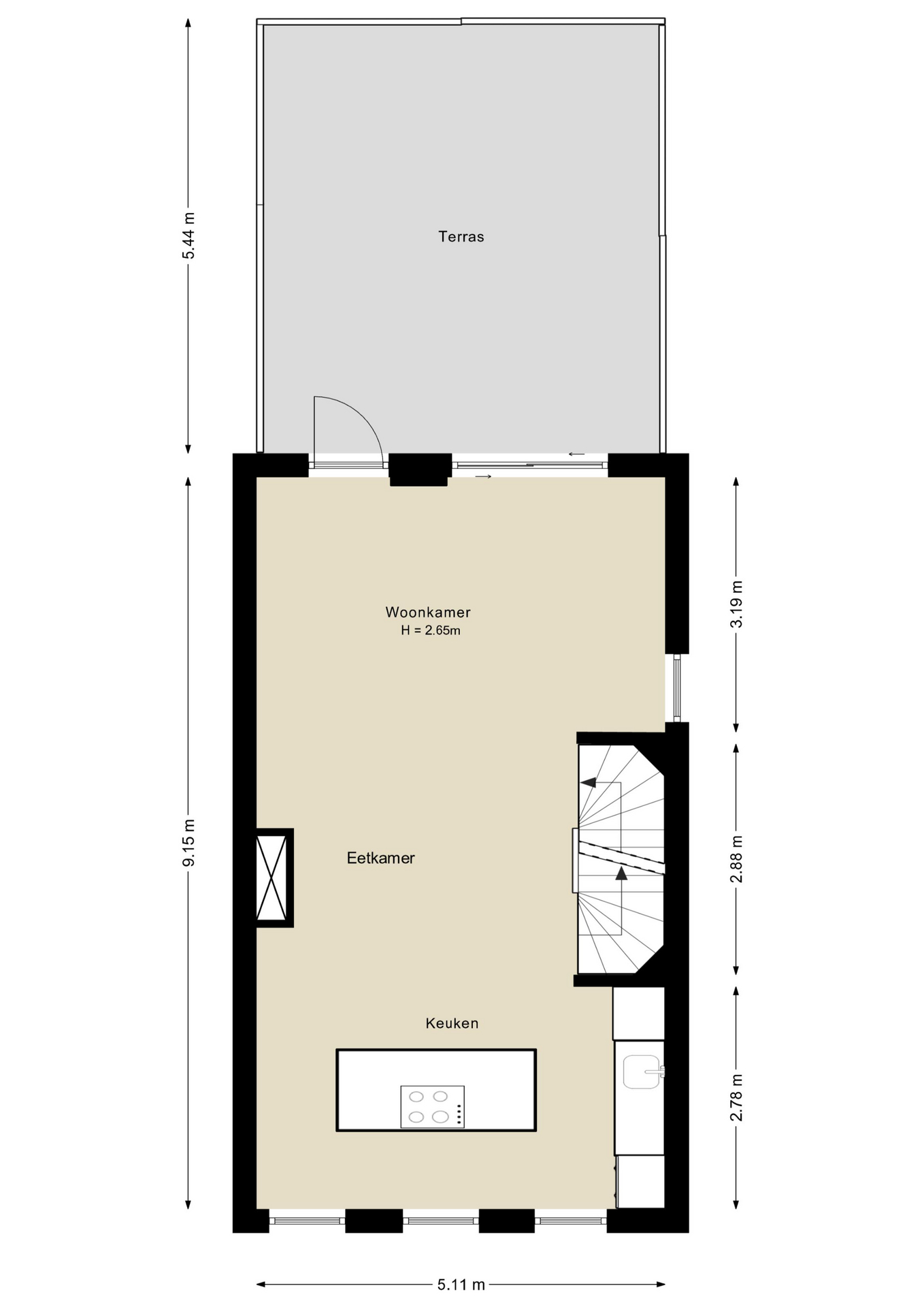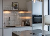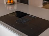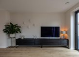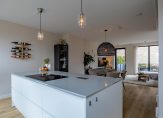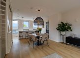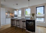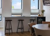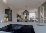 Grote ramen aan drie zijden zorgen voor veel lichtinval en bij het zitgedeelte, aan de achterzijde, is een deur naar het dakterras. Het eetgedeelte grenst aan de luxe keuken, ingedeeld met een wandopstelling en een kookeiland. Het eiland biedt ruimte om te koken en om te zitten, het spoelgedeelte is aan de andere zijde en alle benodigde apparatuur is ingebouwd: een inductie kookplaat met afzuiging, een vaatwasser, combi-oven, koelkast, vriezer en een wijnklimaatkast.