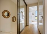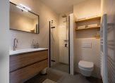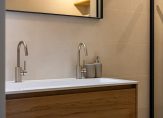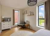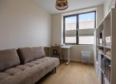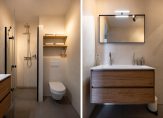 Op de bovenste verdieping zijn een royale overloop, drie slaapkamers, de badkamer en een berging/technische ruimte. Qua wand- en vloerafwerking zie je dezelfde stijl als op de eerste verdieping. Fraai element is de glazen wand met schuifdeur, die het trapgat afsluit van de overloop.