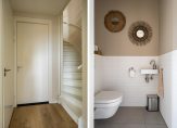 Aan de voorzijde is de master bedroom, over de hele breedte van het huis. De slaapkamers aan de achterzijde zijn ingericht als kleedruimte en werk-/logeerkamer. In de badkamer, te bereiken vanaf de overloop, word je omringd door luxe en stijl. De ruimte is ingedeeld met een inloopdouche, wandcloset en een tweepersoons wastafelmeubel. Ook aan details is gedacht; twee houten planken boven het toilet, een fraaie douchedeur en een spiegel met verlichting.
