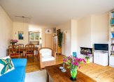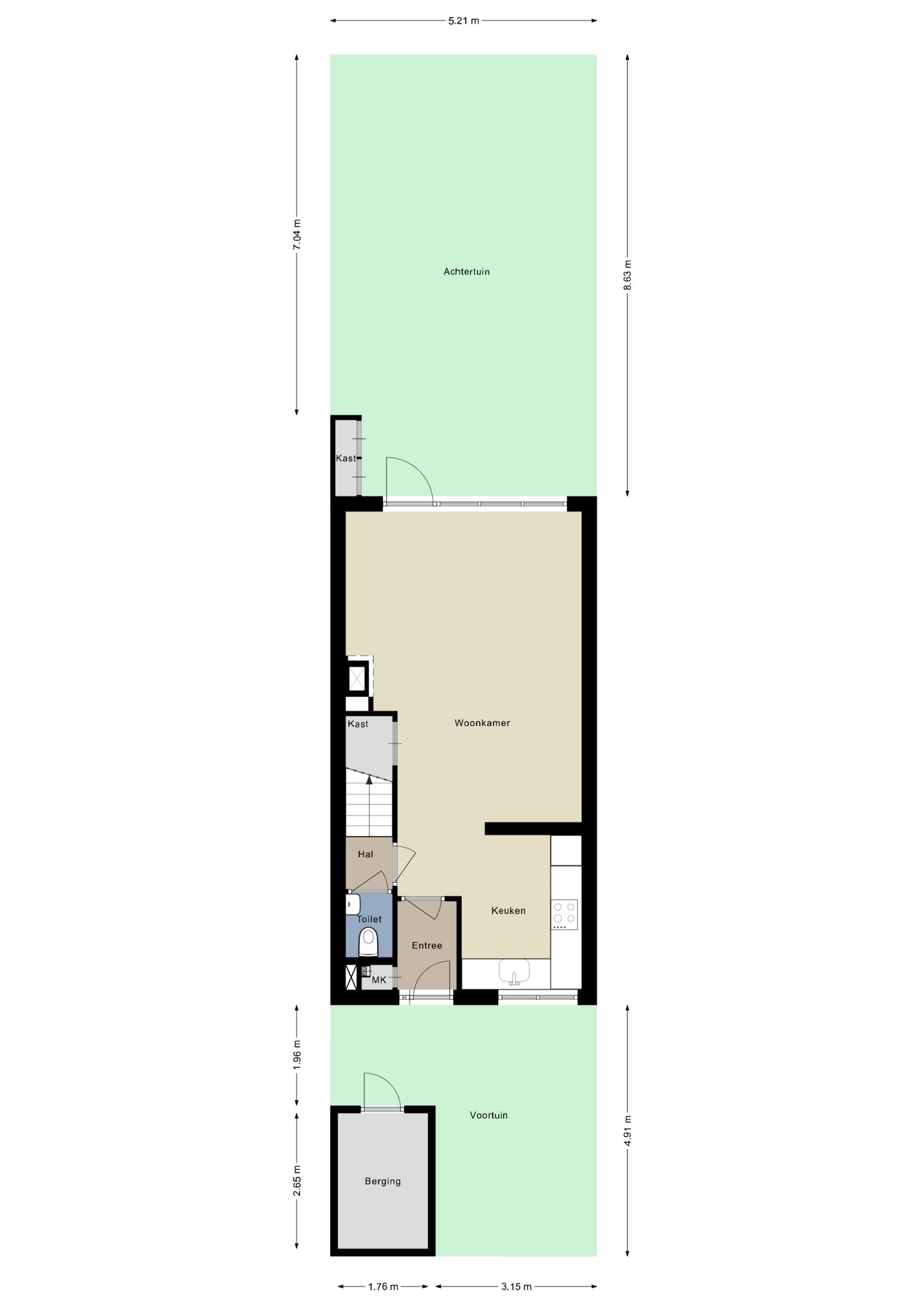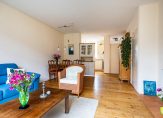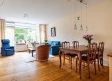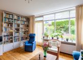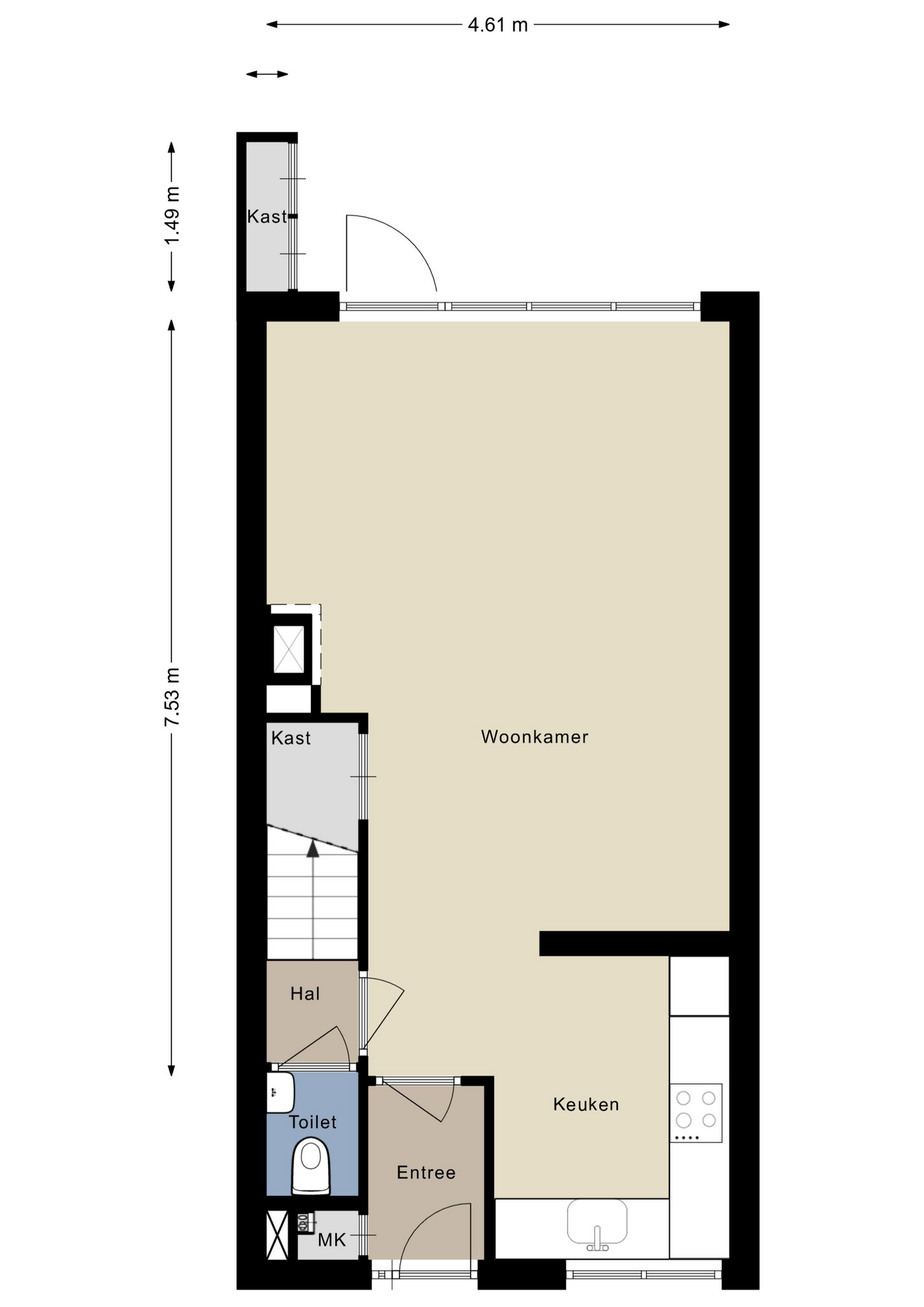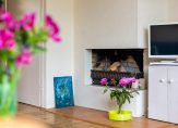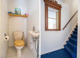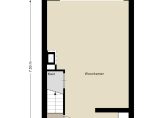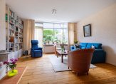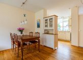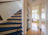 Met een maximale lengte van ruim 7.50 meter is de woonkamer, met lichtinval vanaf de westkant, een fijne leefruimte met genoeg plek voor een zit- en een eethoek. De grenen vloer zorgt, samen met de open haard, voor sfeer en er is een handige bergkast onder de trap. Aan de andere kant van de trap is nog een deur, naar het trapportaal met toiletruimte.