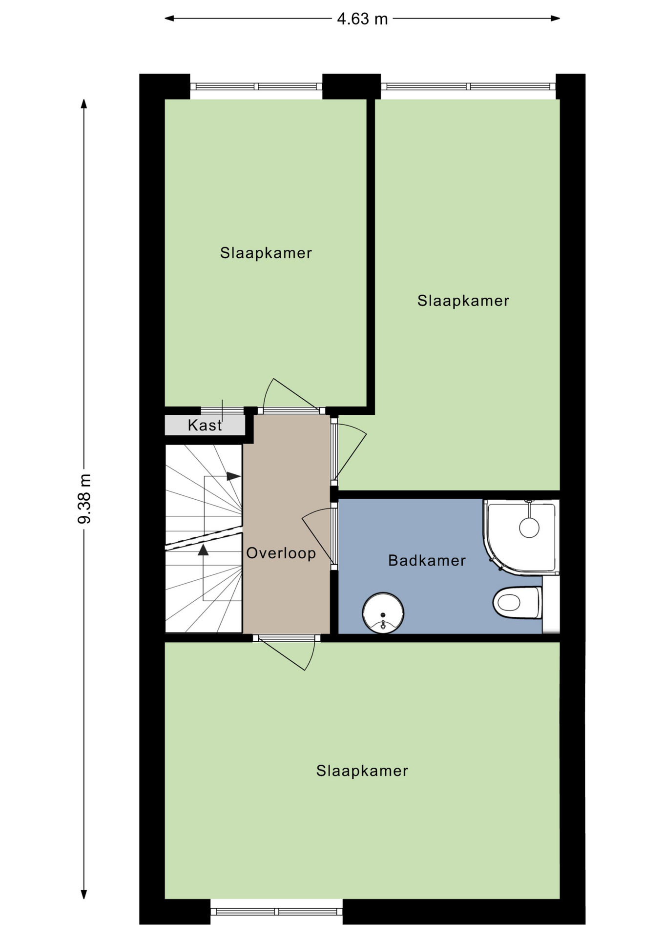 In totaal zijn er drie slaapkamers op de eerste verdieping, waarvan twee aan de achterzijde. De derde, tevens grootste slaapkamer is aan de voorzijde. In alle slaapkamers zie je een hoog, schuin dak wat de kamers optisch een stuk groter maakt. Met laminaat op de vloer en kunststof kozijnen met HR ++ glas kun je al snel beginnen met schilderen, inrichten en stylen.