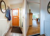 Achter de voordeur, wit aan de buitenzijde en kleurrijk oranje aan de binnenzijde, is de hal van deze lichte woning. Aan de linkerzijde is de meterkast (vernieuwd in 2022) en recht voor je is de deur naar de woonkamer.