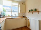 Aan de voorzijde, waar de ochtendzon naar binnen valt, is de keuken. Hier staat een lichte hoekopstelling met een inductie kookplaat, afzuigkap, oven, vaatwasser, koelkast en een vriezer. Alle apparatuur is in de afgelopen drie jaar vernieuwd.