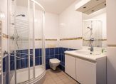 Achter de laatste deur is de badkamer, met geheel betegelde muren waarin ook kleur te zien is. Je hebt de beschikking over een kwartronde douche, wandcloset en een wastafelmeubel.