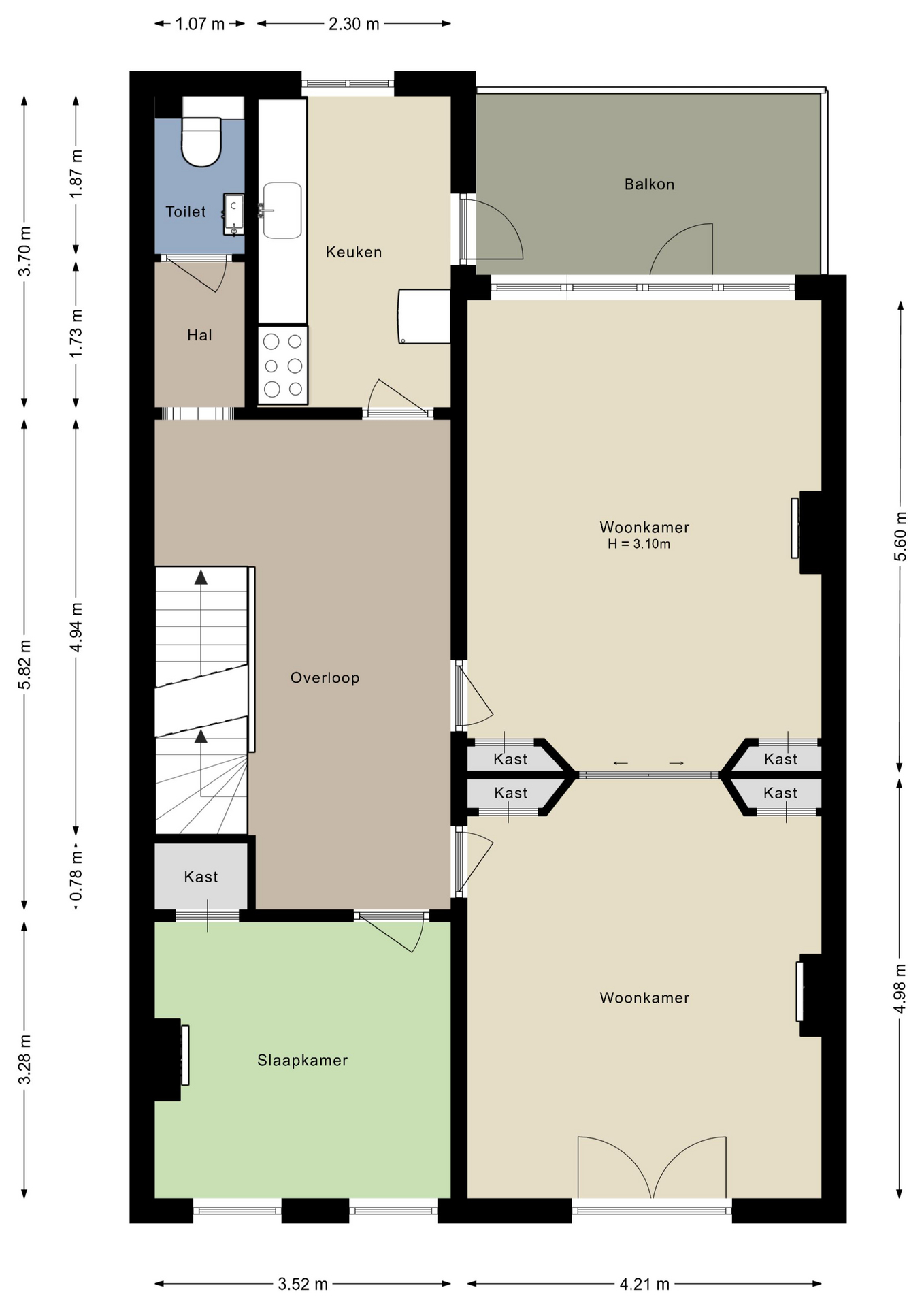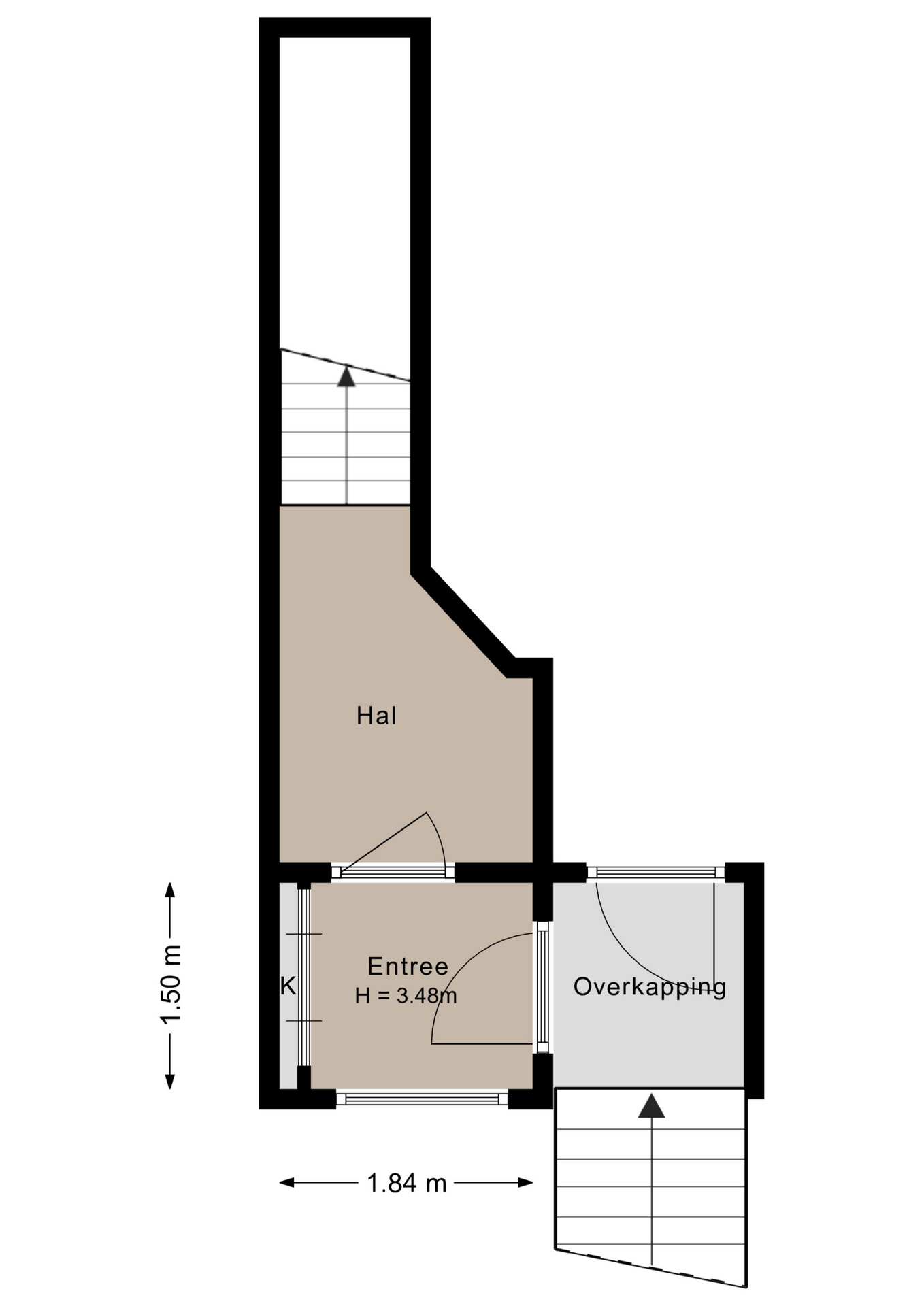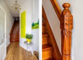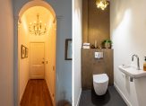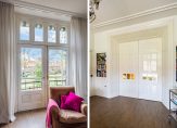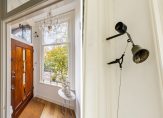 Achter de voordeur is de hal met een vestibule, een prachtige bel en een sierlijke trap naar de eerste verdieping. Door het grote raam valt veel licht naar binnen en het plafond heeft een hoogte van bijna 3.50 meter. Dit is een ontvangst in stijl!