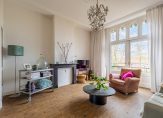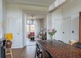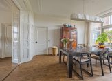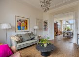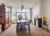 De klassieke en-suite indeling maakt van de woonkamer een fraaie leefruimte, met de zitkamer aan de voorzijde en de eetkamer aan de achterzijde. Er is veel moois te zien, van hoge ornamentenplafonds tot paneeldeuren en stijlvolle schouwen die allen nog een decoratieve functie hebben. Ook de en-suite verdeling met vaste kasten, schuifdeuren en houten panelen is een lust voor het oog.