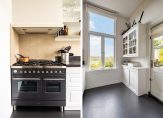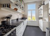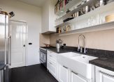 Aan de achterzijde is de dichte keuken, te bereiken vanuit de hal. Bij het vernieuwen van de keukenopstelling is er gekozen voor een inrichting die goed past bij de servieskast en de rest van de woning. Op de planken, in de lades en in de kasten kun je veel spullen opbergen en de dubbele spoelbak met hardstenen aanrechtblad maakt de keuken meer dan af. Het gasfornuis met dubbele oven, de afzuiging in schouw en de vaatwasser (2018) blijven achter.